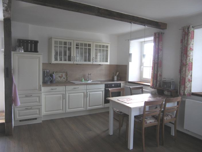 Die Wohnküche ist gemütlich im ländlichen Stil eingerichtet.